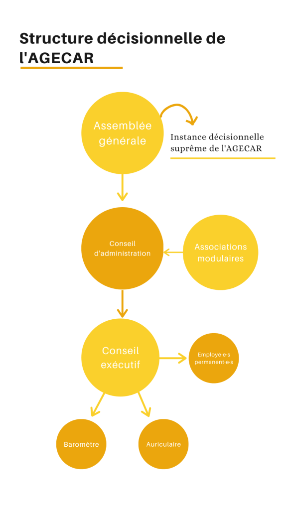 Le Conseil d’administration (CA) est une instance élue qui assume les responsabilités légales et sociales de l’AGECAR, applique les mandats de l’AG et prend les décisions administratives et financières majeures concernant l’association, dont l’embauche de l’équipe permanente. Le CA est d’abord formé de trois membres du CE. Ensuite, depuis 2019 l’AG a confié la nomination des autres administrateur·trice·s de l’AGECAR aux associations modulaires, qui doivent chacune nommer une personne qui la représentera au sein du CA. Dans l’éventualité d’un dysfonctionnement du CE, c’est le CA qui devrait assurer le fonctionnement de l’association.